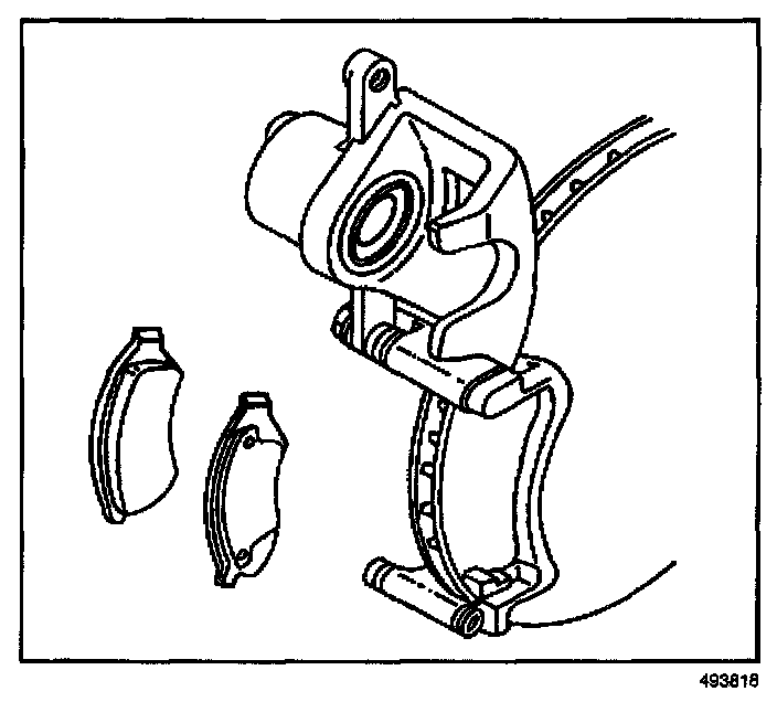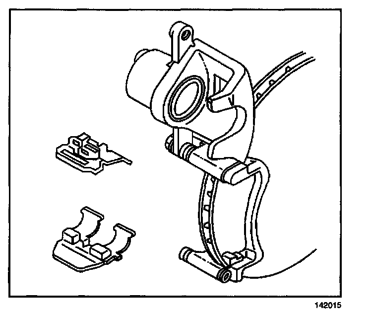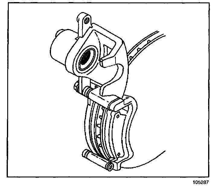 Notice: Support the brake caliper with heavy mechanic's wire, or equivalent, whenever it is separated from it's mount and the hydraulic flexible brake hose is still connected. Failure to support the caliper in this manner will cause the flexible brake hose to bear the weight of the caliper which may cause damage to the brake hose and in turn may cause a brake fluid leak.