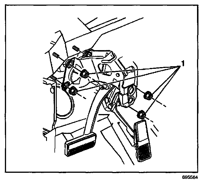 21. Remove the vacuum booster attaching nuts (1) from the brake pedal assembly.