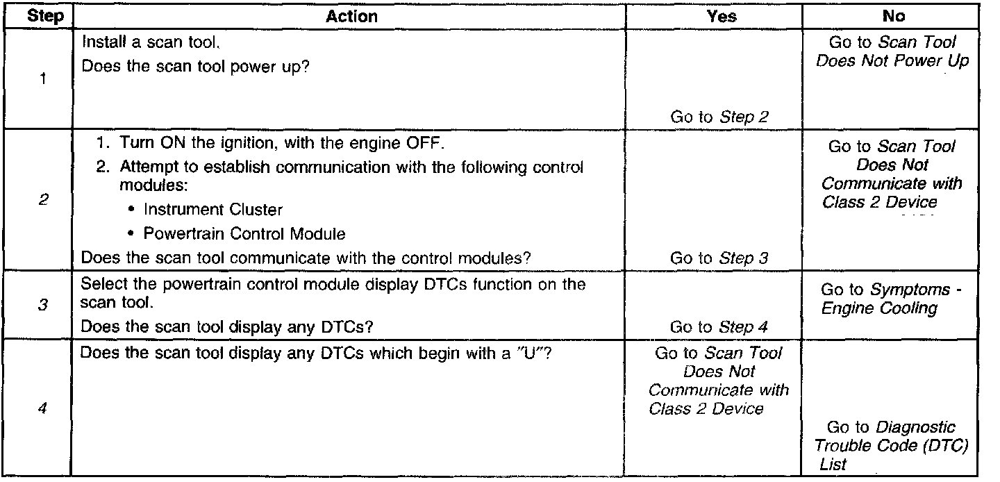 2. Lack of communication may be due to a partial malfunction of the class 2 serial data circuit or due to a total malfunction of the class 2 serial data circuit. The specified procedure will determine the particular condition.