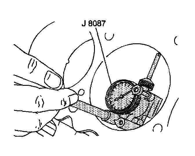 12. Inspect the crankshaft main bearing bores. Use J 8087 to measure the bearing bore concentricity and alignment at the following locations: