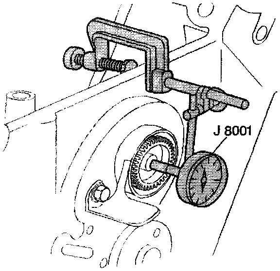18. Using J 8001 measure the gear lash at four places. Measure every quarter turn. Gear lash must be between 0.050 - 0.127 mm (0.002 - 0.005 inch).