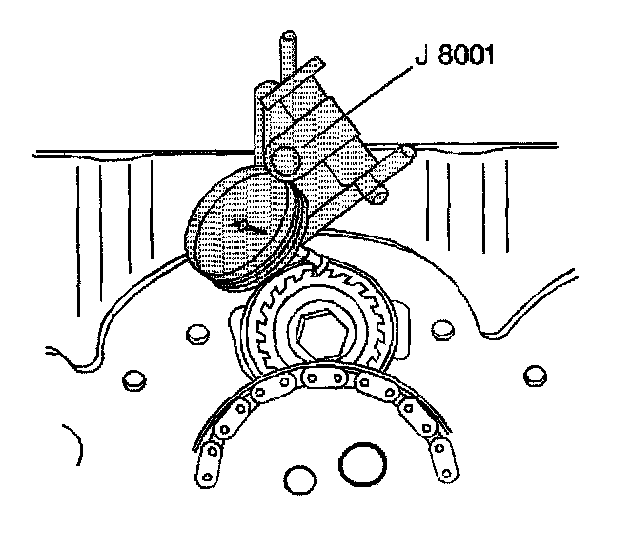 7. Using J 8001 measure the balance shaft radial play at the rear. Radial play must be between 0.0127 - 0.119 mm (0.0005 - 0.0047 inch).