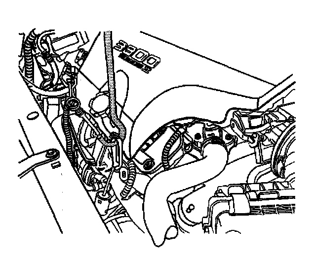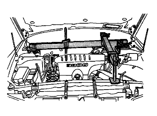 19. Install the swivel lift hook, J 28467-8A, through the front engine lift hook bracket. Ensure the hook does not damage the surrounding components.