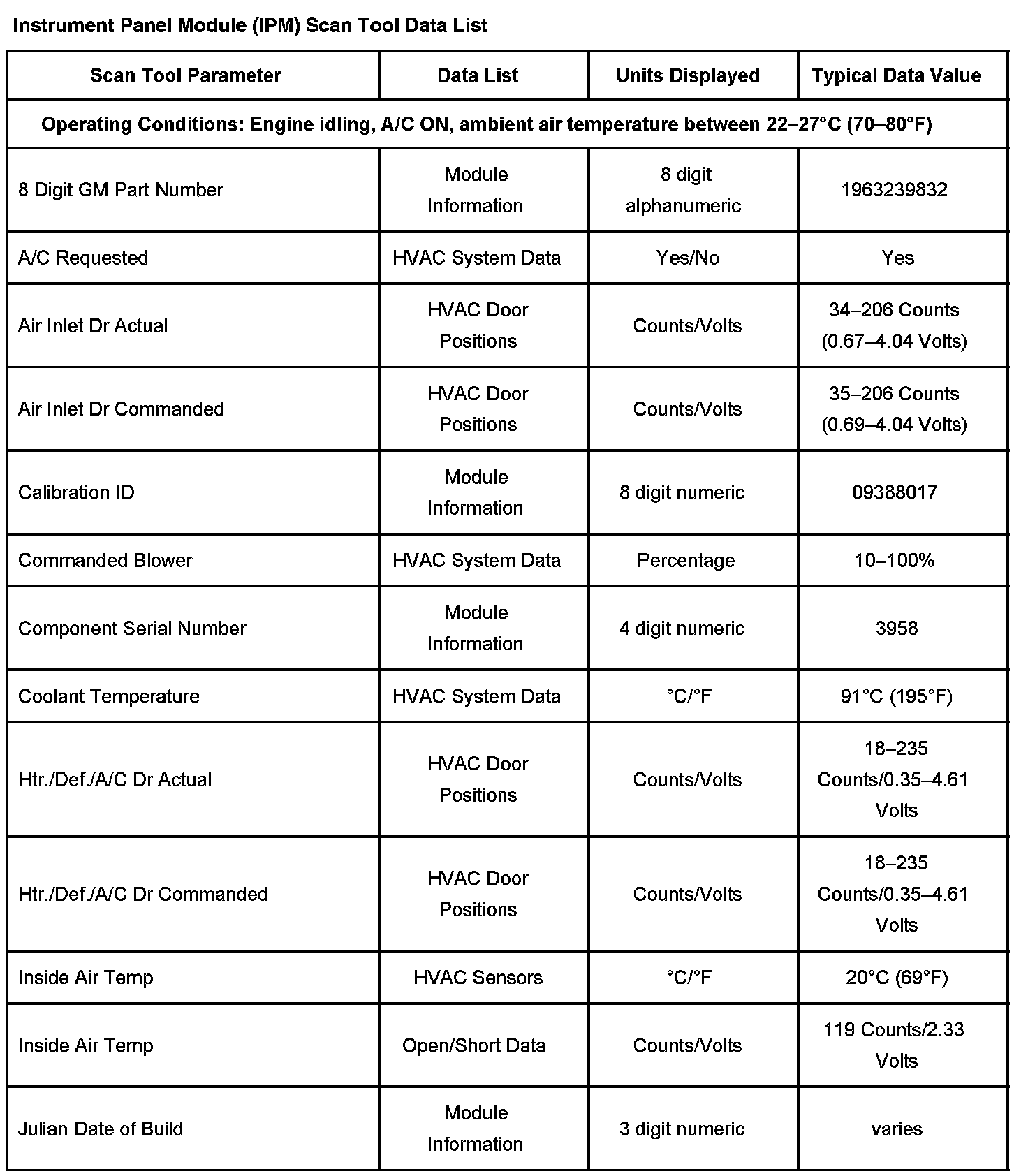 Use the Scan Tool Data Display Values and Definitions Information in order to assist in diagnosing the Instrument Panel Integration Module (IPM) problems. Compare the vehicles actual scan tool data with the typical data display value table information. Use the data information in order to aid in understanding the nature of the problem when the vehicle does not match with the typical data display values.