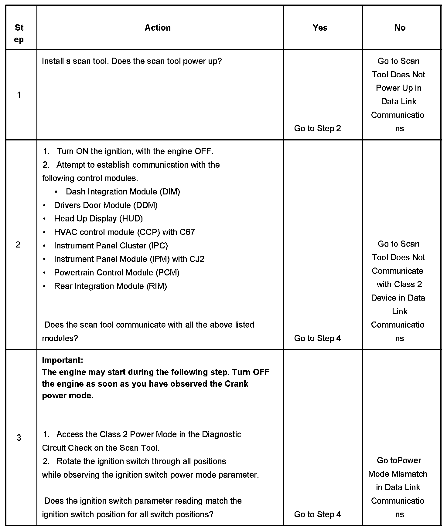 2. Lack of communication may be due to a partial malfunction of the class 2 serial data circuit or due to a total malfunction of the class 2 serial data circuit. The specified procedure will determine the particular condition.