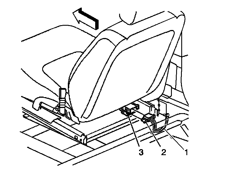 7. Remove the Connector Position Assurance (CPA) (1) from the RF/passenger side impact module yellow connector (3) which is located under the passenger seat.