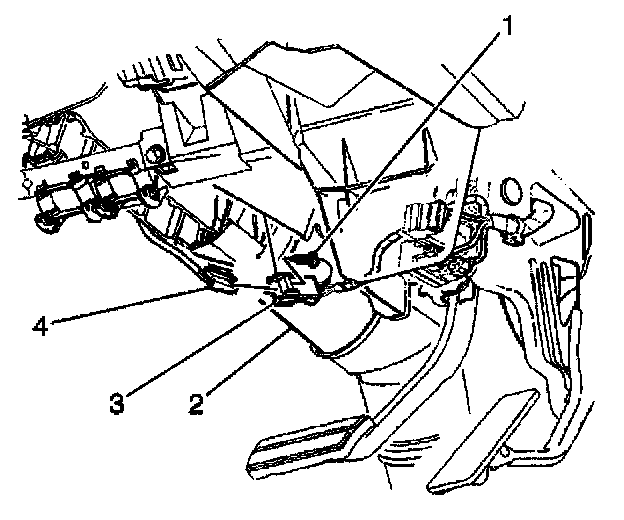 10. Remove the CPA (4) from the vehicle harness yellow connector (2) located below I/P (3).