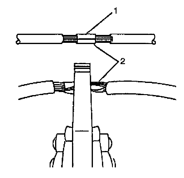 7. Center the splice clip (2) over the stripped wires (1) and hold the clip in place.