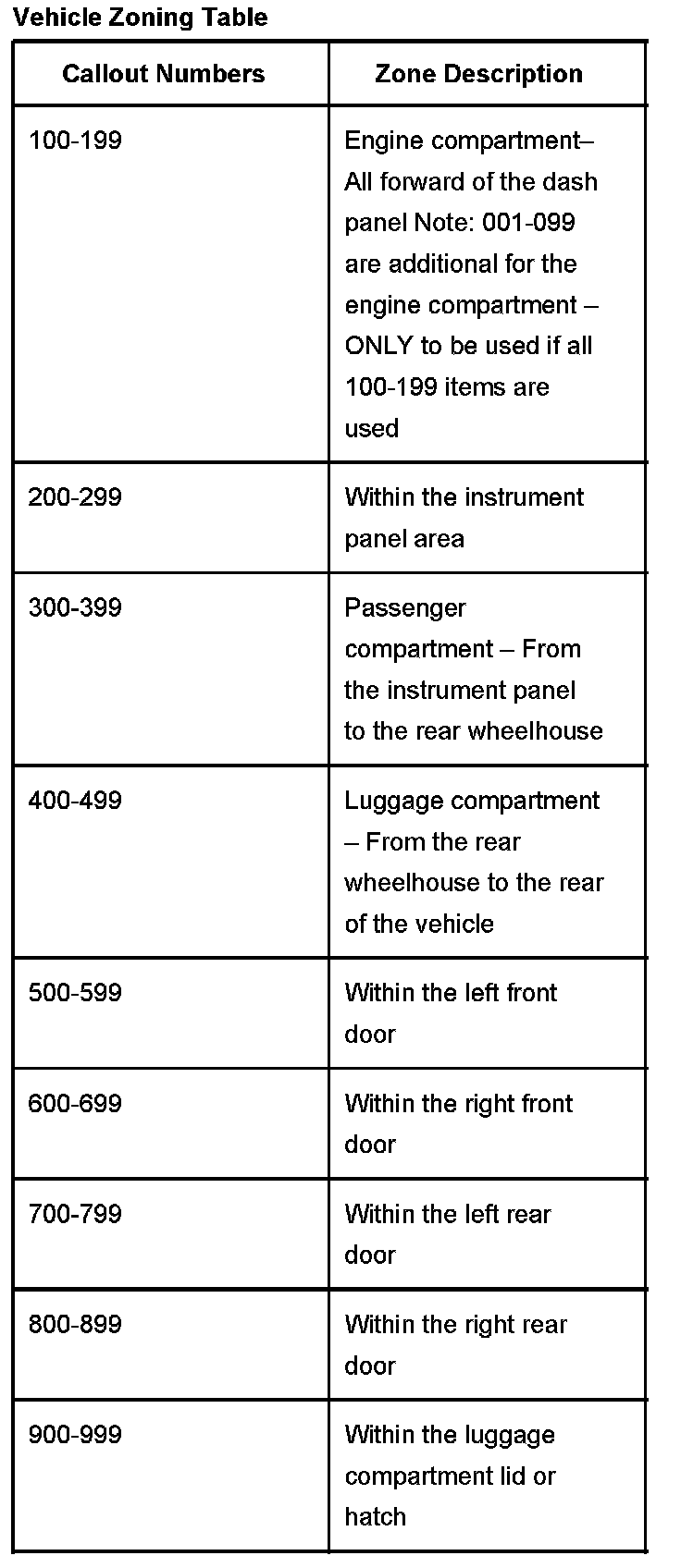 All grounds, in-line connectors, pass-through grommets, and splices have identifying numbers that corresponds to where they are located in the vehicle. The table explains the numbering system.