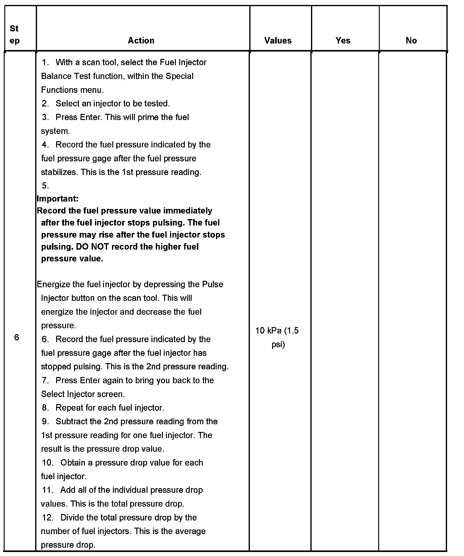 6. If the pressure drop value for each fuel injector is within 10 kPa (1.5 psi) of the average pressure drop value, the fuel injectors are flowing properly.