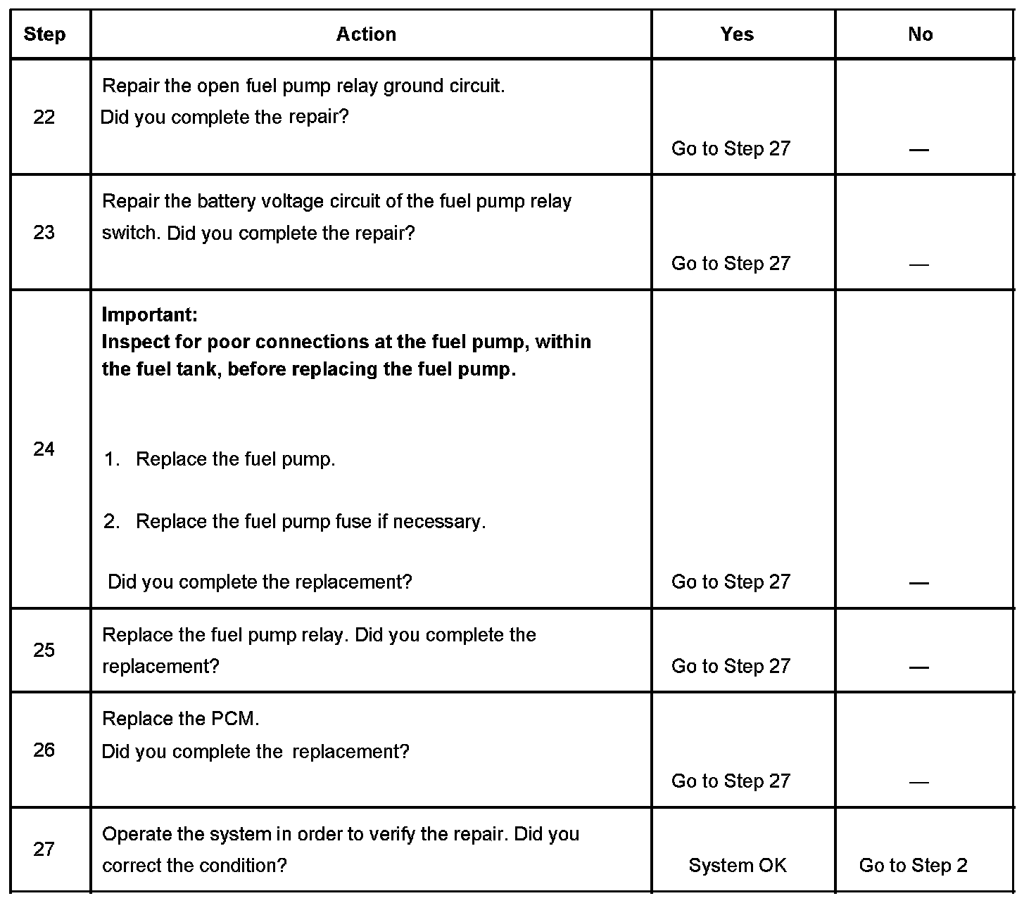 5. This step tests for an open in the ground circuit to the fuel pump relay.