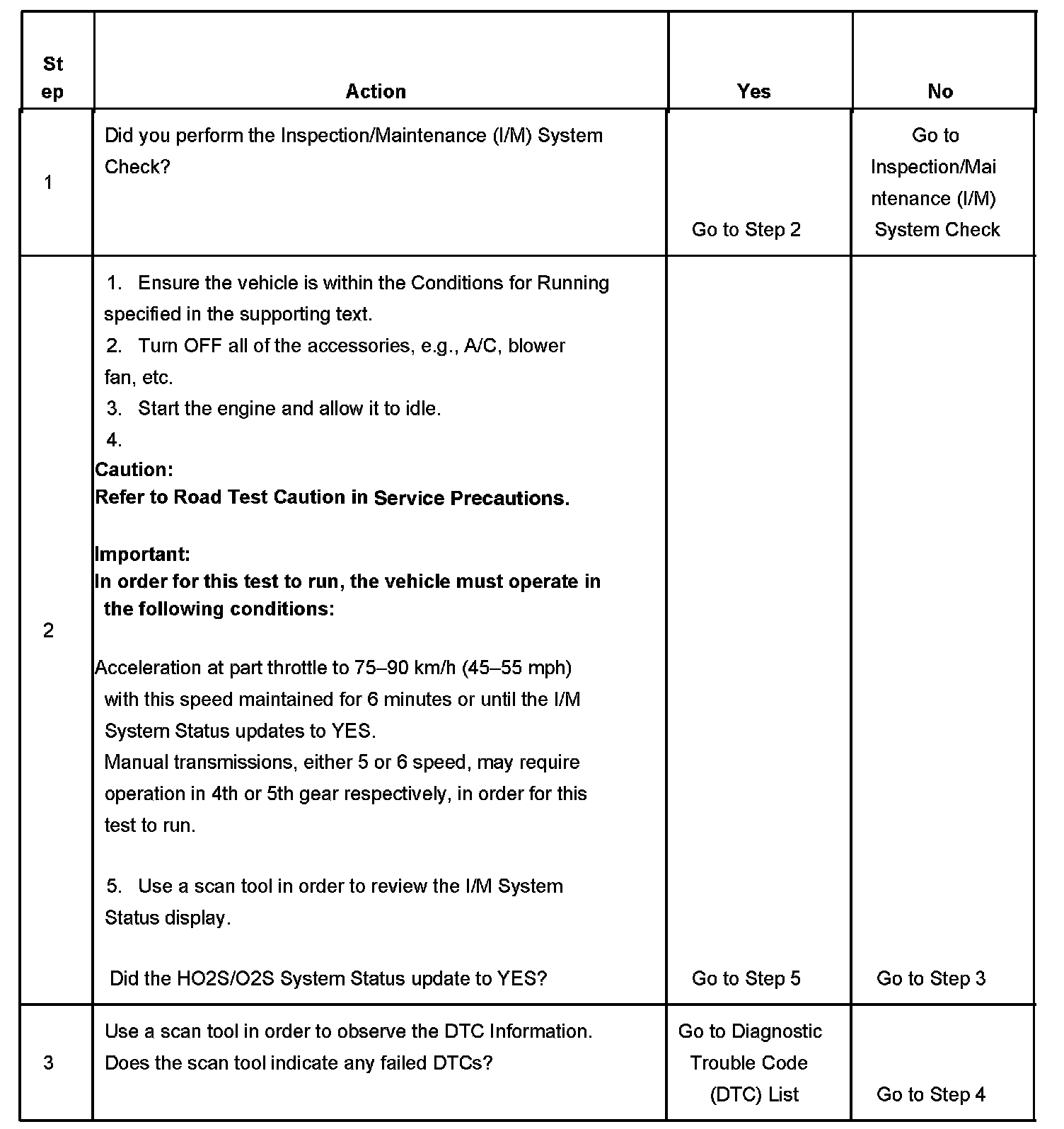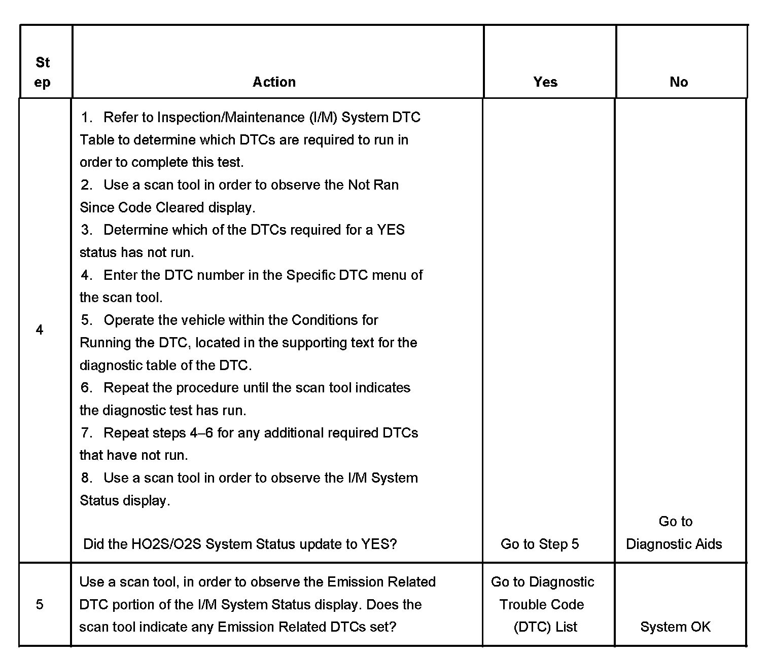 3. This step is to identify a first failure of a type B DTC. A DTC only appears on the I/M System Status display when it becomes a MIL illuminating DTC. This occurs on the second failure of a type B DTC. A first failure of a type B DTC will not allow the I/M System Status to update to YES. Refer to Diagnostic Aids.