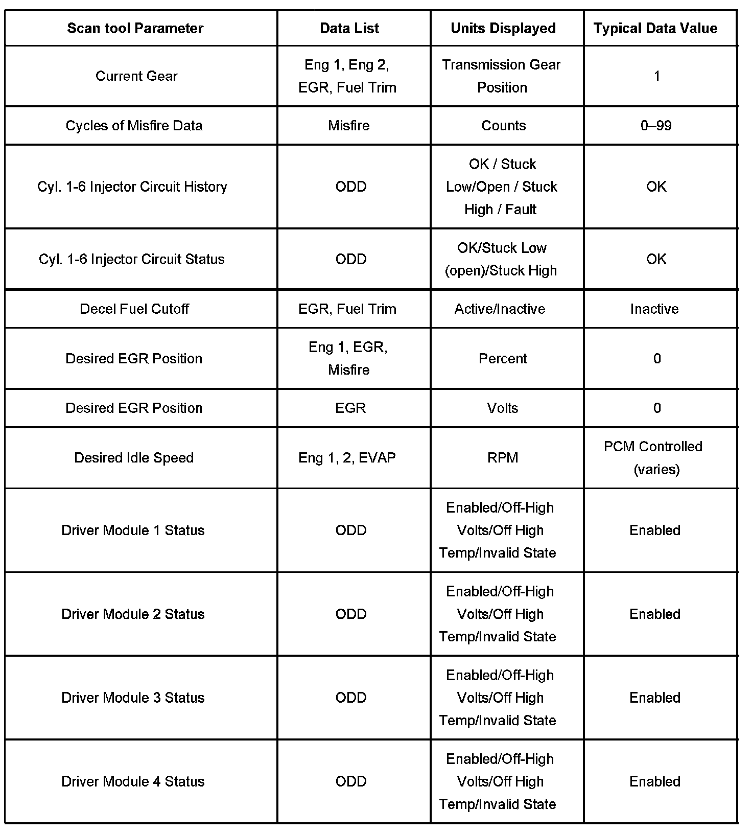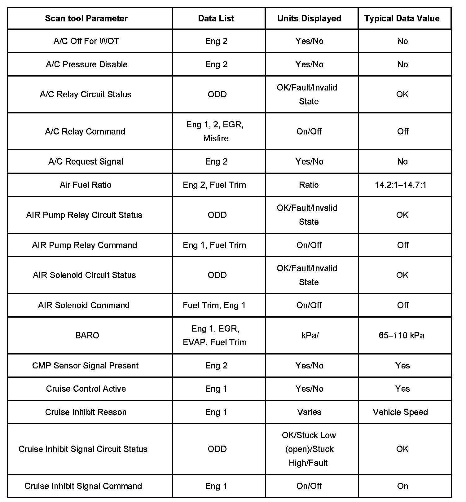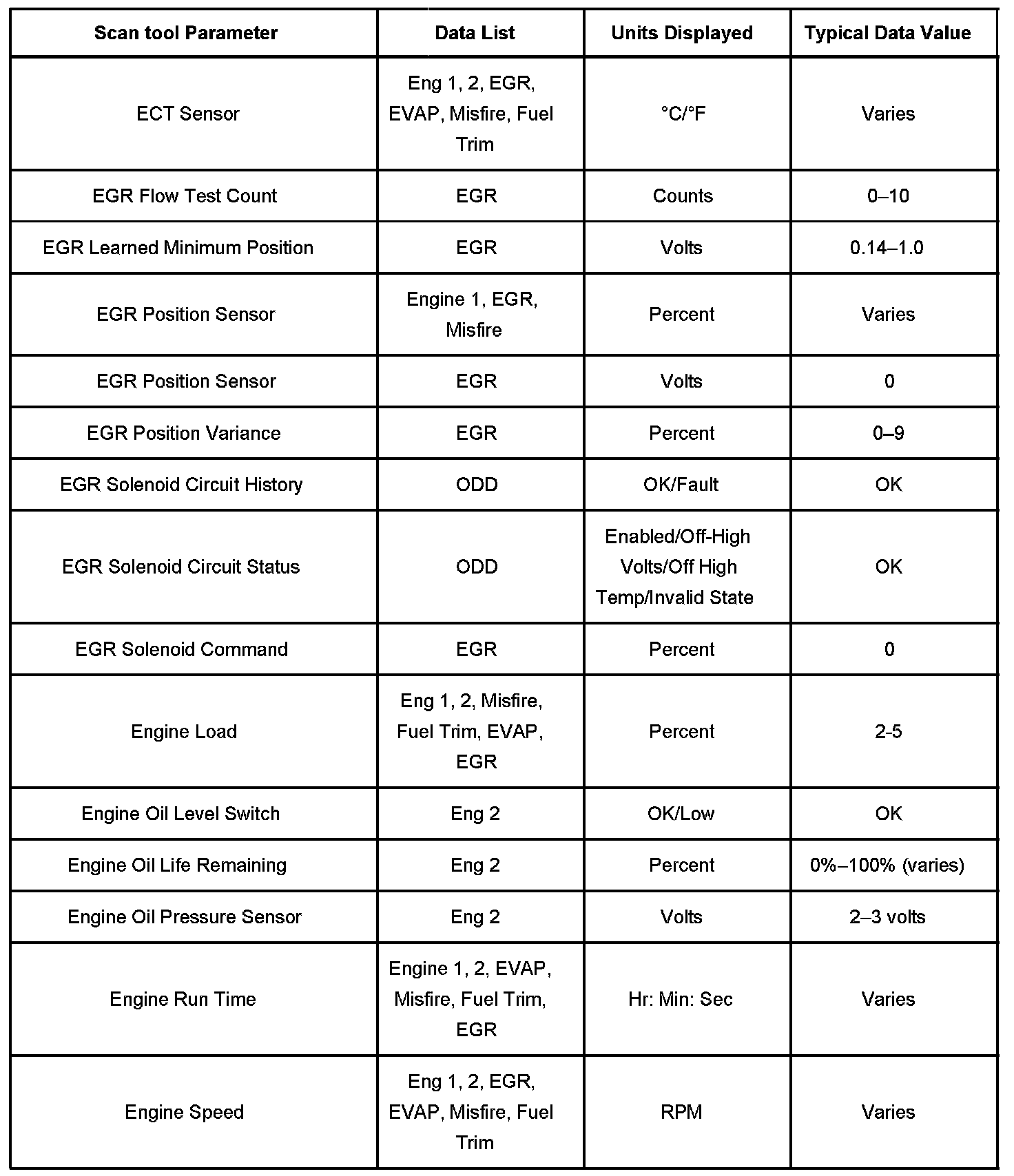 The Engine Scan Tool Data List contains all engine related parameters that are available on the scan tool. The list is arranged in alphabetical order. A given parameter may appear in any one of the data lists, and in some cases may appear more than once, or in more than one data list in order to group certain related parameters together.