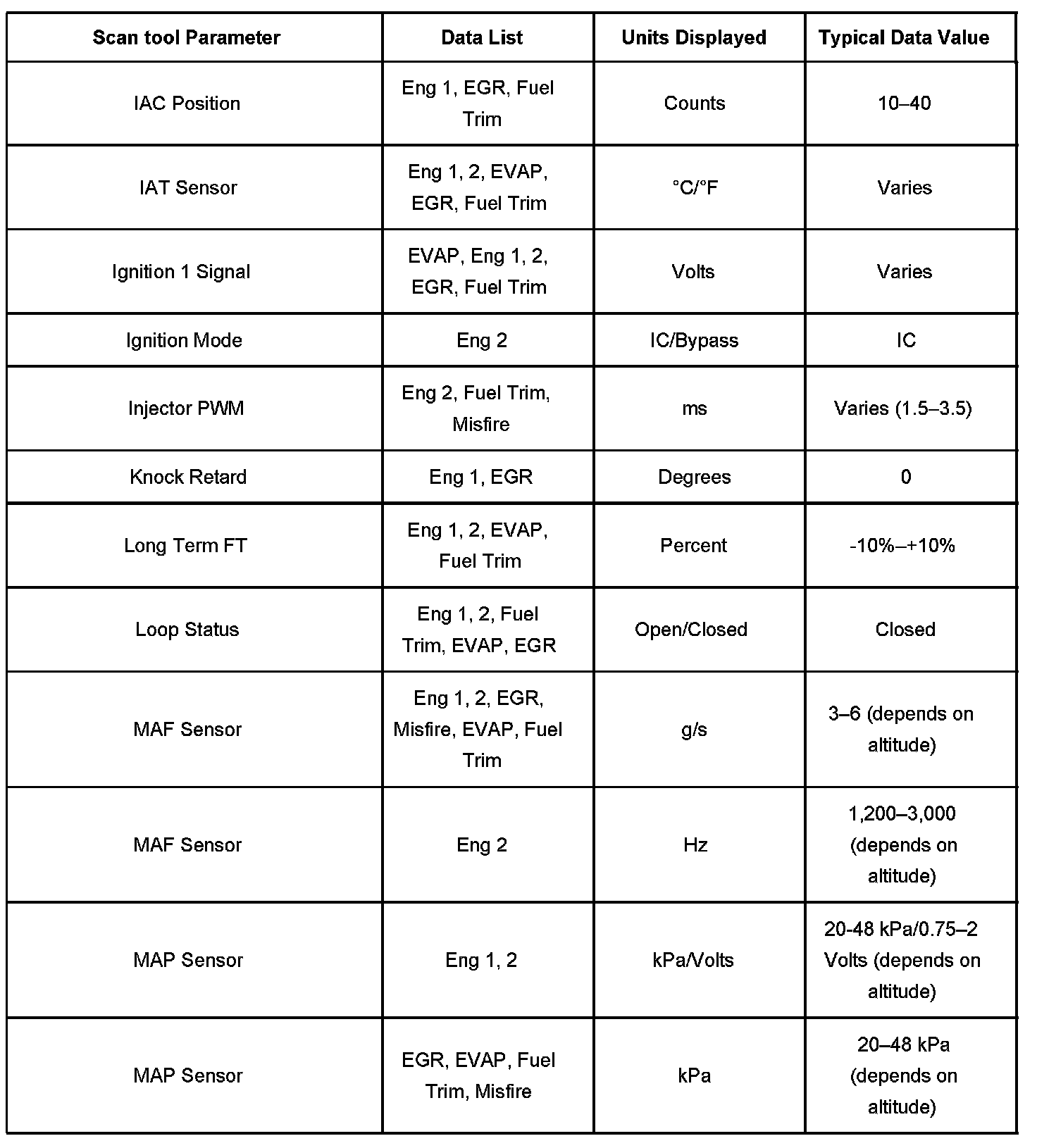 Scan tool values from a properly running engine may be used for comparison with the engine you are diagnosing. The Engine Scan Tool Data List represents values that would be seen on a normally running engine.