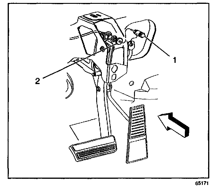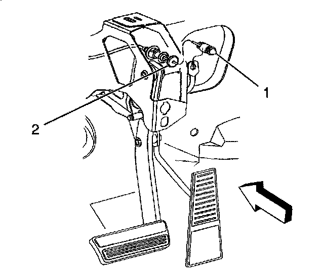 3. Install the accelerator control cable (1) through the slot in the accelerator pedal lever (2).