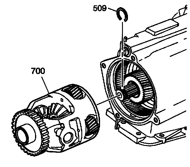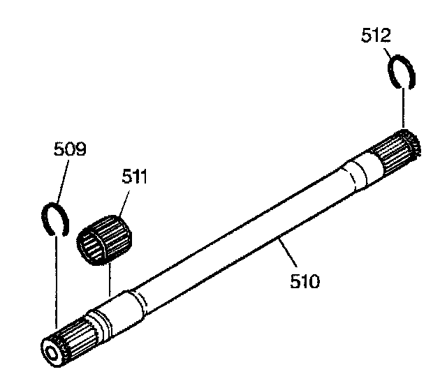 2. Install the drive axle retaining ring (509) and the output shaft differential inboard snap ring (512) onto the output shaft (510).