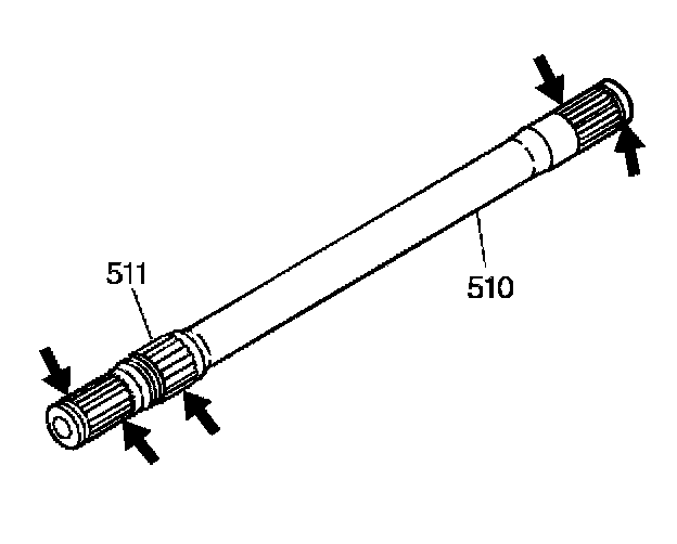 4. Hold the front differential carrier in place and carefully install the output shaft (510) into the transmission through the left wheel opening. Extend the output shaft through the differential side gear.