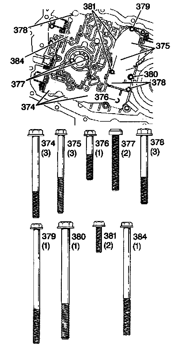 12. Tighten the control valve body bolts (374-381, 384) as indicated by the following list.