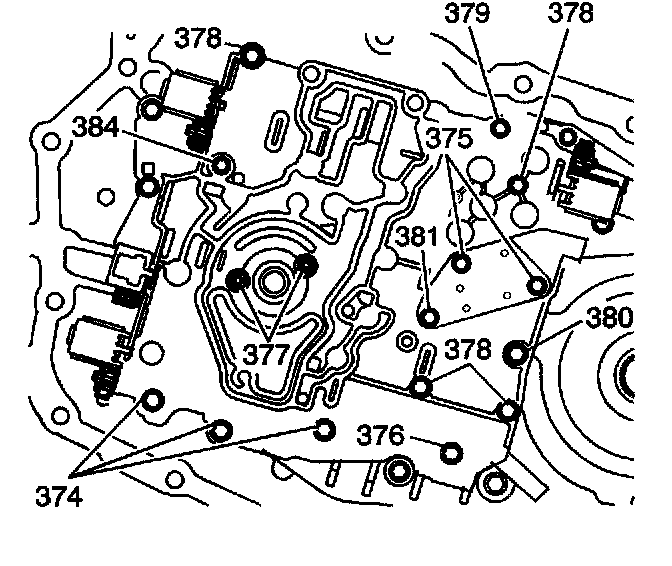 4. Remove the valve body to channel plate bolts (374-381, 384).