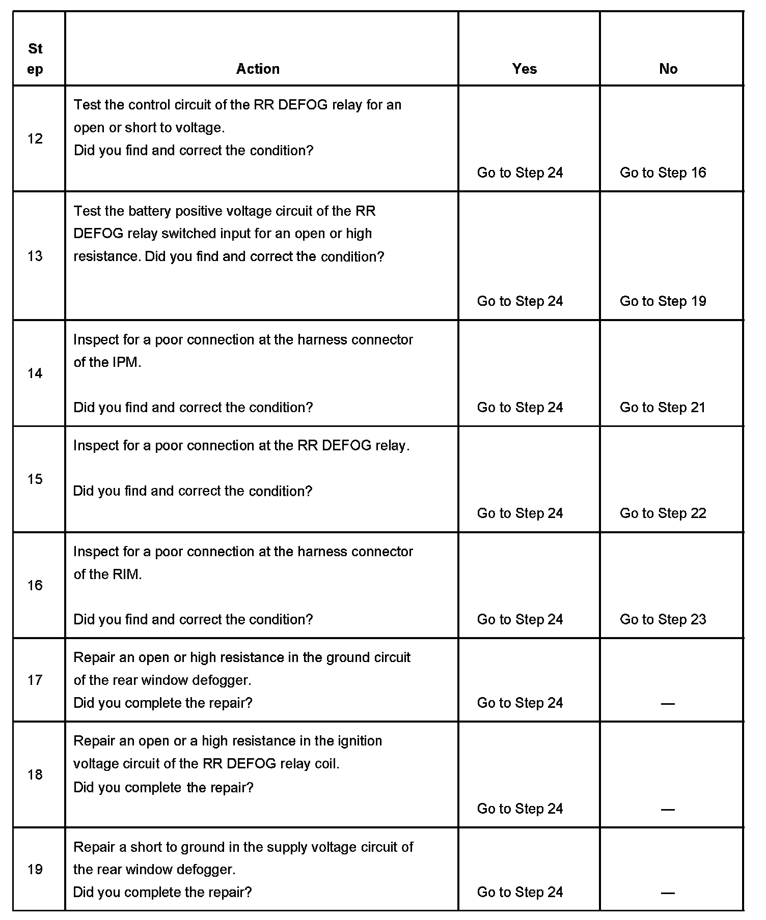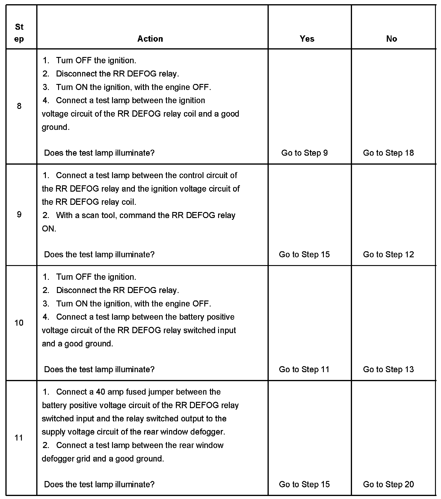 7. Gain access to the RR DEFOG relay and listen for an audible click when the relay operates. Command both the ON and OFF states of the RR DEFOG relay. Repeat the commands as necessary.