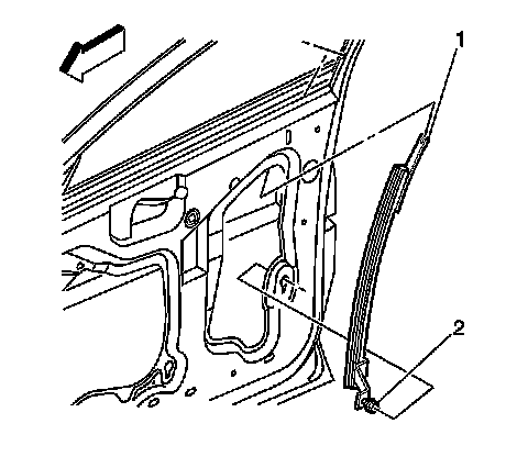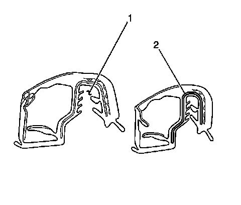 Important: When reusing the window weatherstrip, the flange mounting area (1) must be pinched together in order to counteract the splaying effect when removed. Use a thumb and an index finger in order to pinch the carrier (2) back together. Work from one end of the weatherstrip to the other.