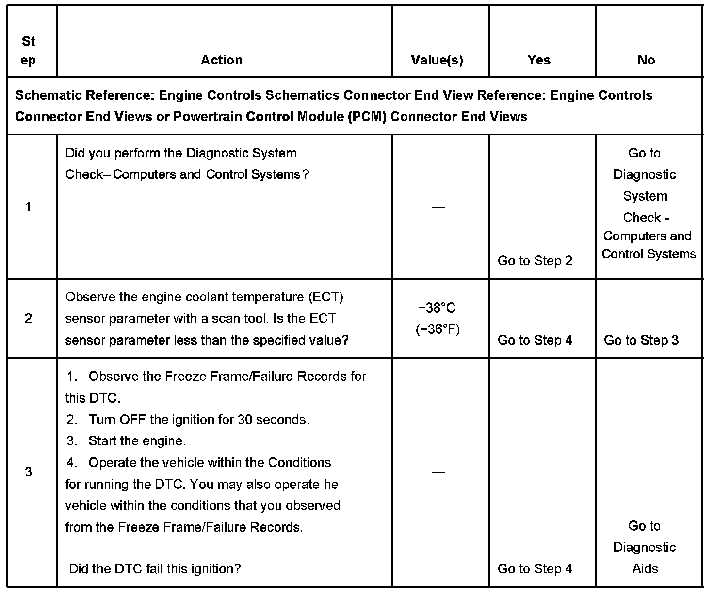 The PCM detects that the ECT sensor parameter is less than -38°C (-36°F) for more than 24 seconds.