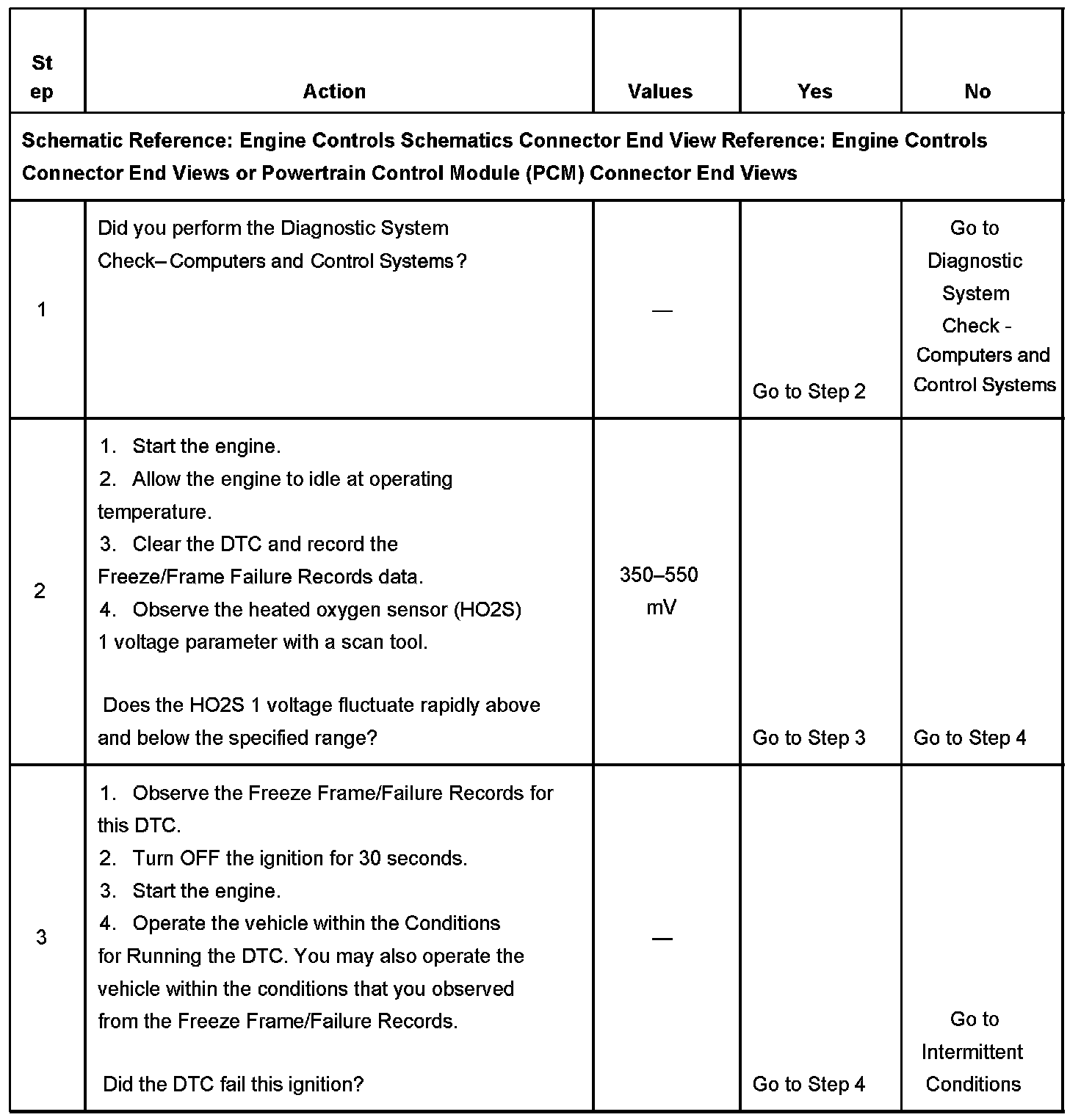 CIRCUIT DESCRIPTIONHeated oxygen sensors (HO2S) are used for fuel control and post catalyst monitoring. Each HO2S compares the oxygen content of the surrounding air with the oxygen content of the exhaust stream. When the vehicle is first started, the powertrain control module (PCM) operates in an Open Loop mode, ignoring the HO2S signal voltage when calculating the air-to-fuel ratio. The PCM supplies the HO2S with a reference, or bias, voltage of about 450 mV. The HO2S generates a voltage within a range of 0-1,000 mV that fluctuates above and below bias voltage once in Closed Loop. A high HO2S voltage output indicates a rich fuel mixture. A low HO2S voltage output indicates a lean mixture. Heating elements inside the HO2S minimize the time required for the sensors to reach operating temperature, and provide an accurate voltage signal. If the PCM detects an active HO2S 1 signal of a lower than calibrated minimum amplitude, DTC P0130 will set.