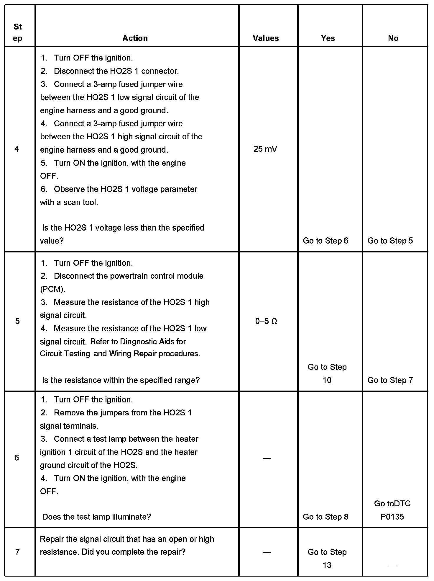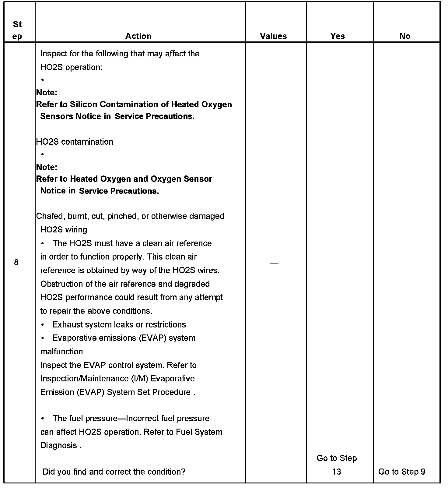 8. The conditions listed in the table may contribute to the failure of the HO2S. The conditions listed apply only to this type of failure.