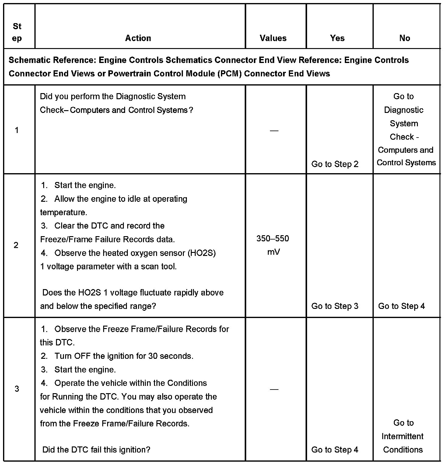 CIRCUIT DESCRIPTIONHeated oxygen sensors (HO2S) are used for fuel control and post catalyst monitoring. Each HO2S compares the oxygen content of the surrounding air with the oxygen content of the exhaust stream. When the vehicle is first started, the powertrain control module (PCM) operates in an Open Loop mode, ignoring the HO2S signal voltage when calculating the air-to-fuel ratio. The PCM supplies the HO2S with a reference, or bias, voltage of about 450 mV. The HO2S generates a voltage within a range of 0-1,000 mV that fluctuates above and below bias voltage once in Closed Loop. A high HO2S voltage output indicates a rich fuel mixture. A low HO2S voltage output indicates a lean mixture. Heating elements inside the HO2S minimize the time required for the sensors to reach operating temperature, and provide an accurate voltage signal. If the PCM detects that the HO2S 1 voltage average response time is too slow, DTC P0133 will set.