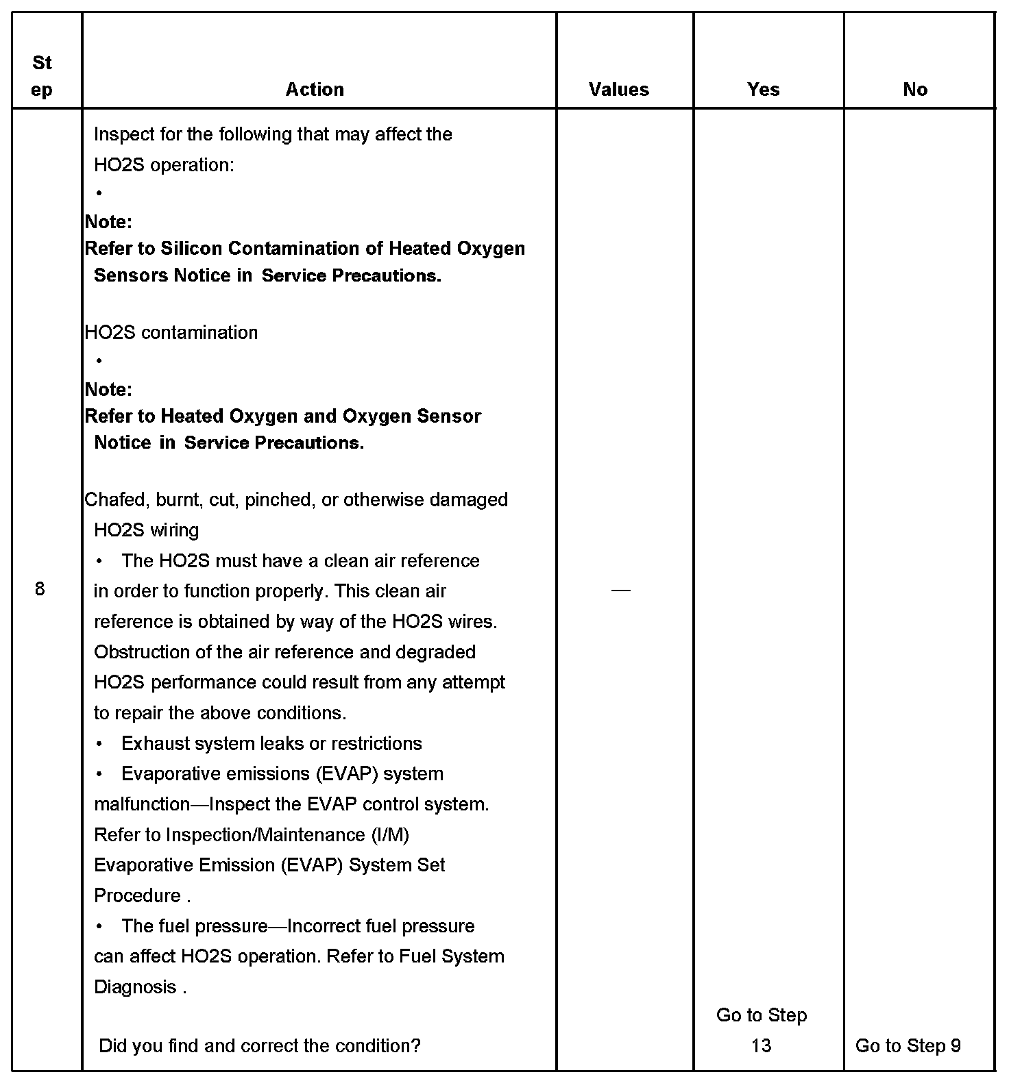 8. The conditions listed in the table may contribute to the failure of the HO2S. The conditions listed apply only to this type of failure.