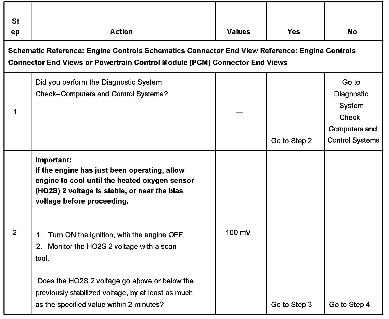 2. The HO2S 2 should be allowed to cool before performing this test. The HO2S 2 is cool enough if the voltage output is stable at bias or, about 450 mV. If the HO2S 2 heater is functioning, the signal voltage will gradually decrease as the sensor element warms. If the heater is not functioning, the HO2S 2 signal will remain near the 450 mV bias voltage.