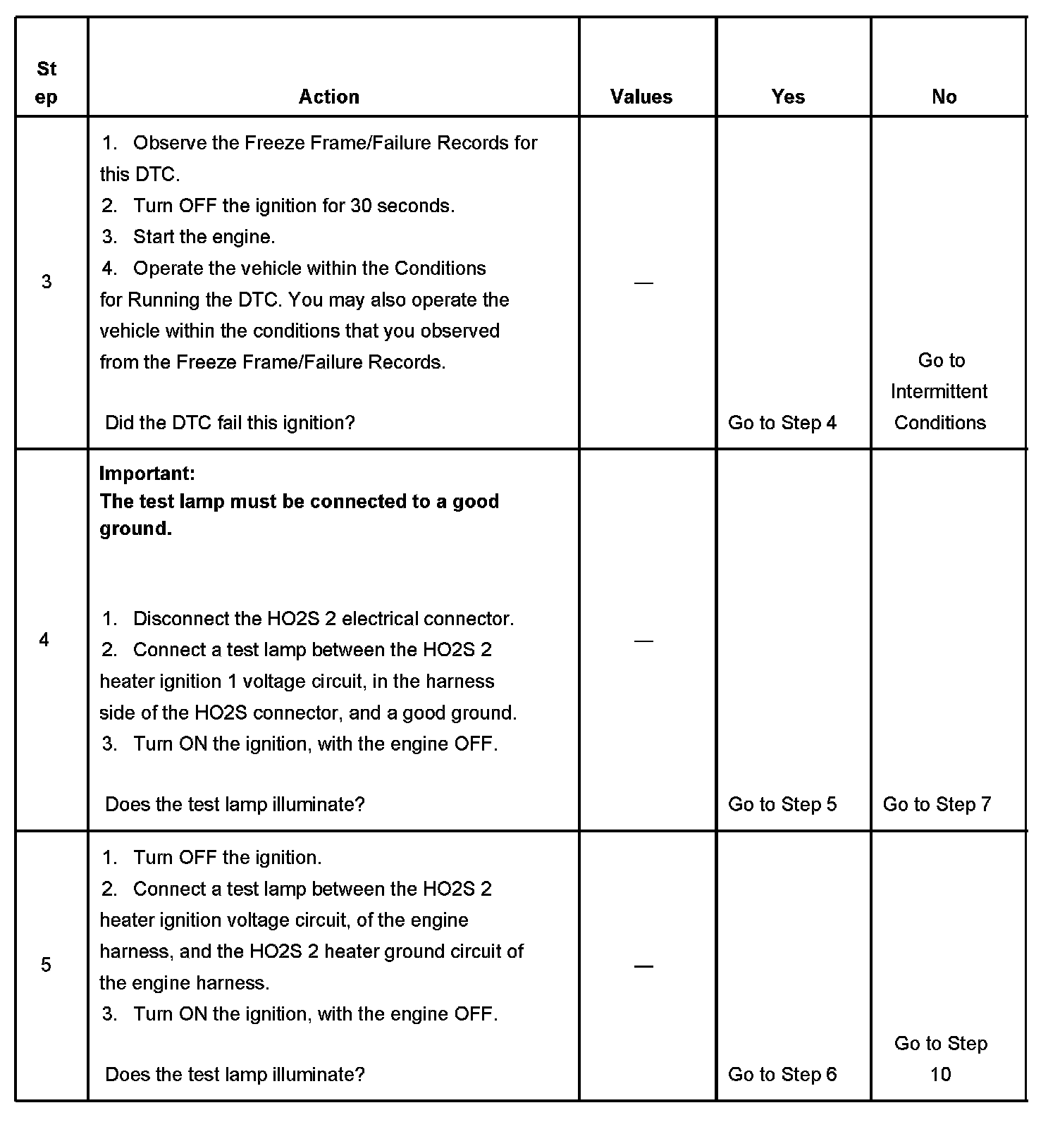 4. This step ensures that the ignition 1 voltage circuit to the HO2S 2 is not open or shorted. The test lamp must be connected to a good ground, independent of the HO2S system.