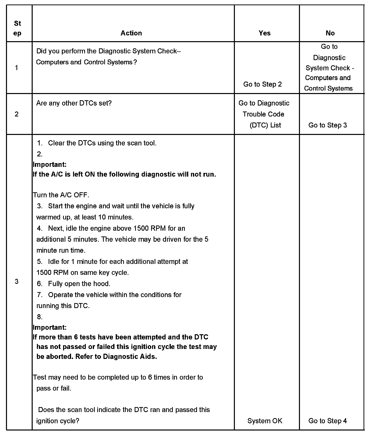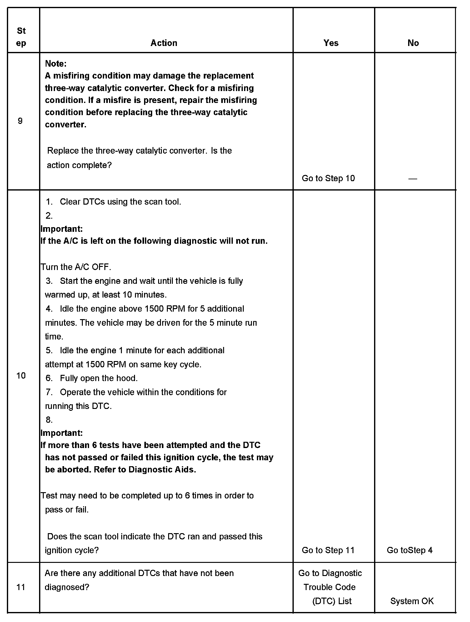 3. Clearing the DTCs allows the catalyst test to be completed up to 18 times and completed up to 6 times this ignition cycle. If the A/C is not turned OFF the diagnostic will not run. The engine must be warmed-up. The converter needs to be warmed-up by raising the engine speed above idle for the specified time prior to each attempted test. Check and see if DTC passed or failed this ignition cycle. If the DTC does not pass or fail look for a possible reason that would cause the test to abort.