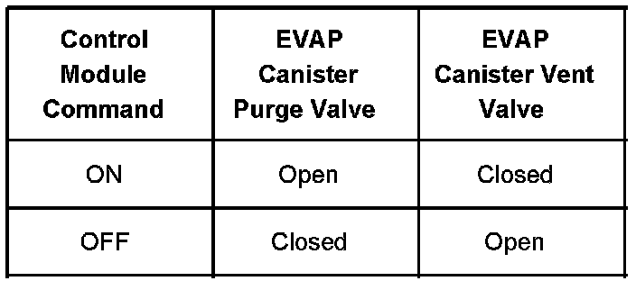 The table illustrates the relationship between the ON and OFF states, and the Open or Closed states of the EVAP canister purge and vent valves.