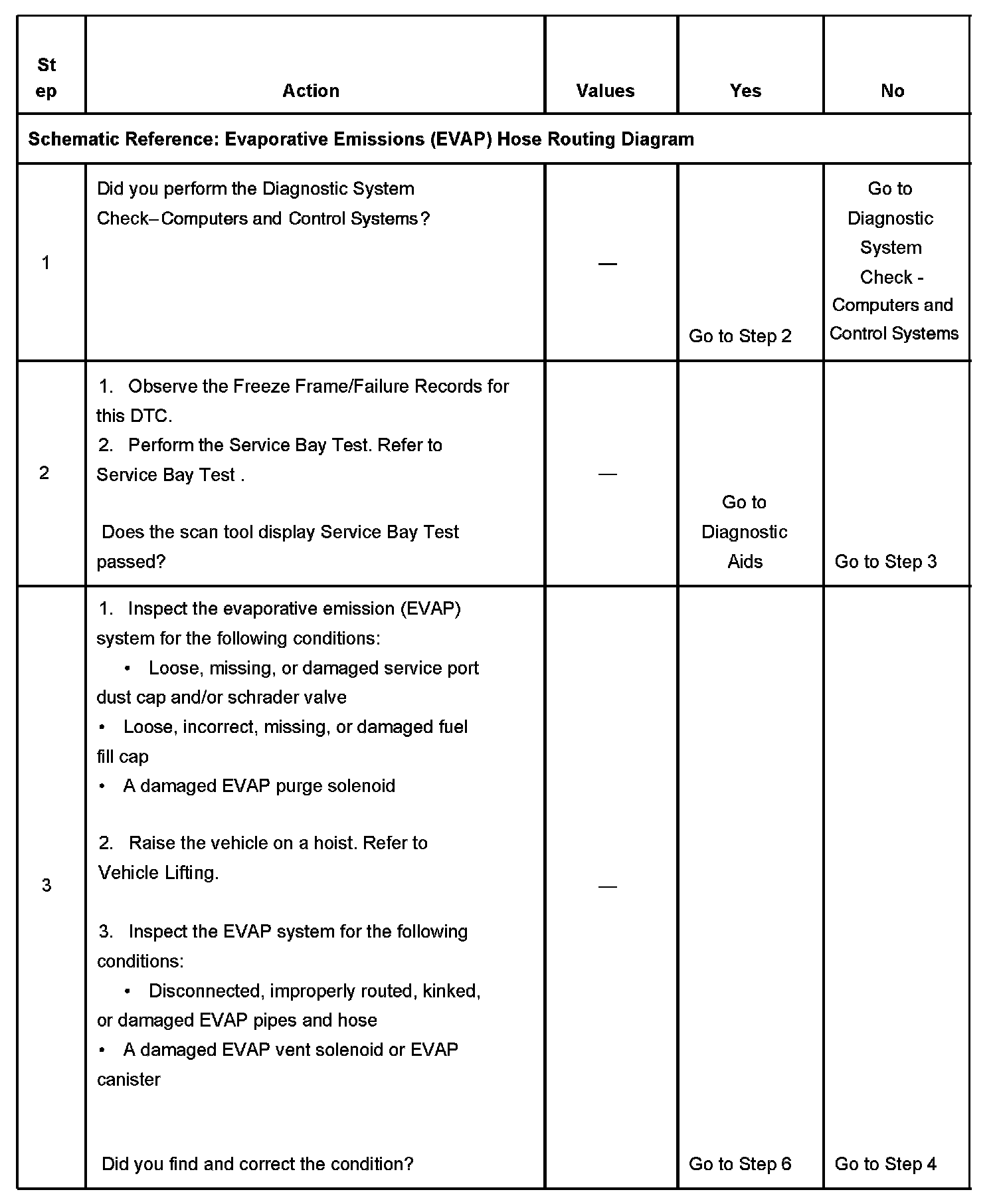 The numbers below refer to the step numbers on the diagnostic table.