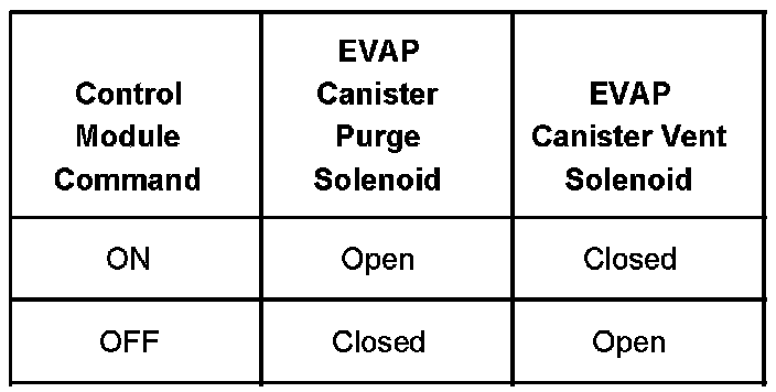 The table illustrates the relationship between the ON and OFF states, and the Open or Closed states of the EVAP canister purge and vent valves.