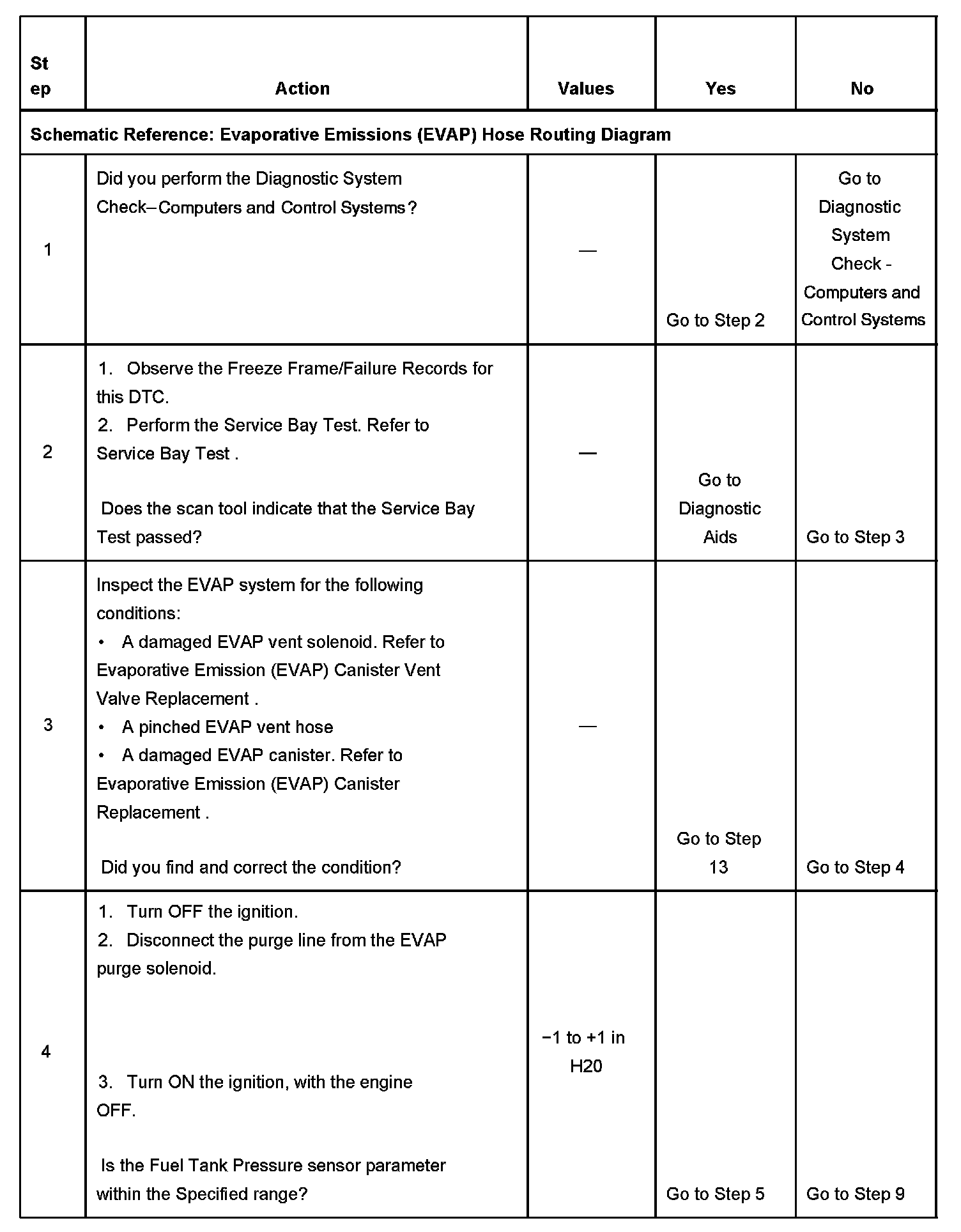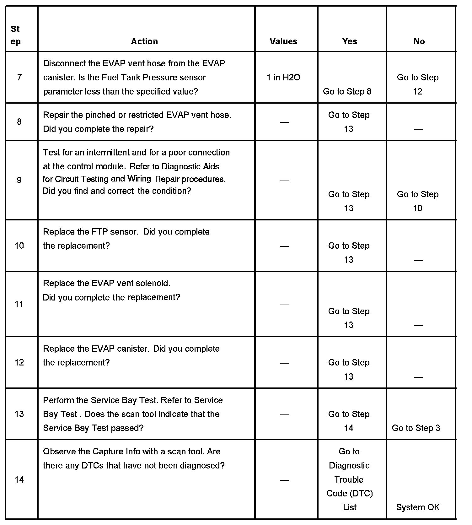 SYSTEM DESCRIPTIONThis DTC tests the evaporative emission (EVAP) system for a restricted or blocked EVAP vent path. The control module commands the EVAP canister purge solenoid Open and the EVAP canister vent solenoid Closed. This allows vacuum to be applied to the EVAP system. Once a calibrated vacuum level has been reached, the control module commands the EVAP canister purge solenoid Closed and the EVAP canister vent solenoid Open. The control module monitors the fuel tank pressure (FTP) sensor for a decrease in vacuum. If the vacuum does not decrease to near 0 inches H2O in a calibrated time, this DTC sets.