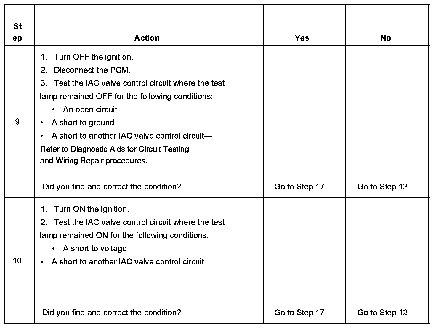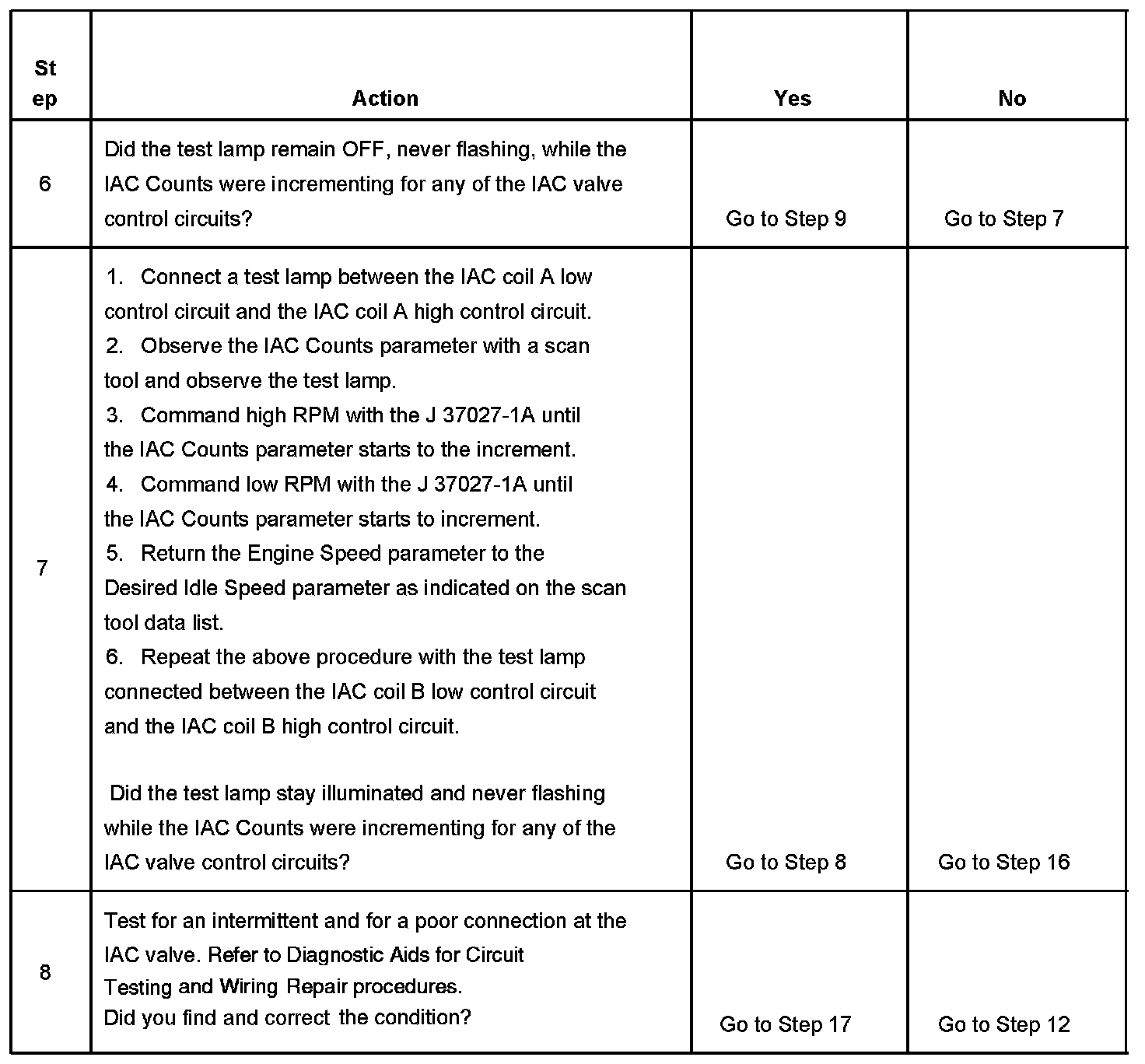 7. This test will determine the ability of the PCM to provide the IAC valve control circuits with a ground. On a normally operating system, the test lamp should not flash while the IAC Counts are incrementing.