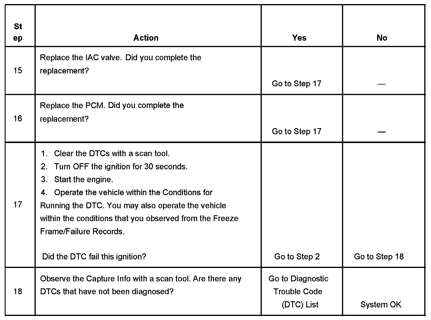CIRCUIT DESCRIPTIONThe engine idle speed is controlled by the idle air control (IAC) valve. The IAC valve is on the throttle body. The IAC valve pintle moves in and out of an idle air passage bore to control air flow around the throttle plate. The IAC valve consists of a movable pintle, driven by a gear attached to an electric motor called a stepper motor. The stepper motor is capable of highly accurate rotation, or of movement, called steps. The stepper motor has 2 separate windings that are called coils. Each coil is supplied current by two circuits from the powertrain control module (PCM). When the PCM changes polarity of a coil, the stepper motor moves one step. The PCM uses a predetermined number of counts to determine the IAC pintle position. Observe IAC counts with a scan tool. The IAC counts will increment up or down as the PCM attempts to change the IAC valve pintle position. An IAC Reset will occur when the ignition key is turned OFF. First, the PCM will seat the IAC pintle in the idle air passage bore. Second, the PCM will retract the pintle a predetermined number of counts to allow for efficient engine start-up. If the engine idle speed is out of range for a calibrated period of time, an idle speed diagnostic trouble code (DTC) sets.