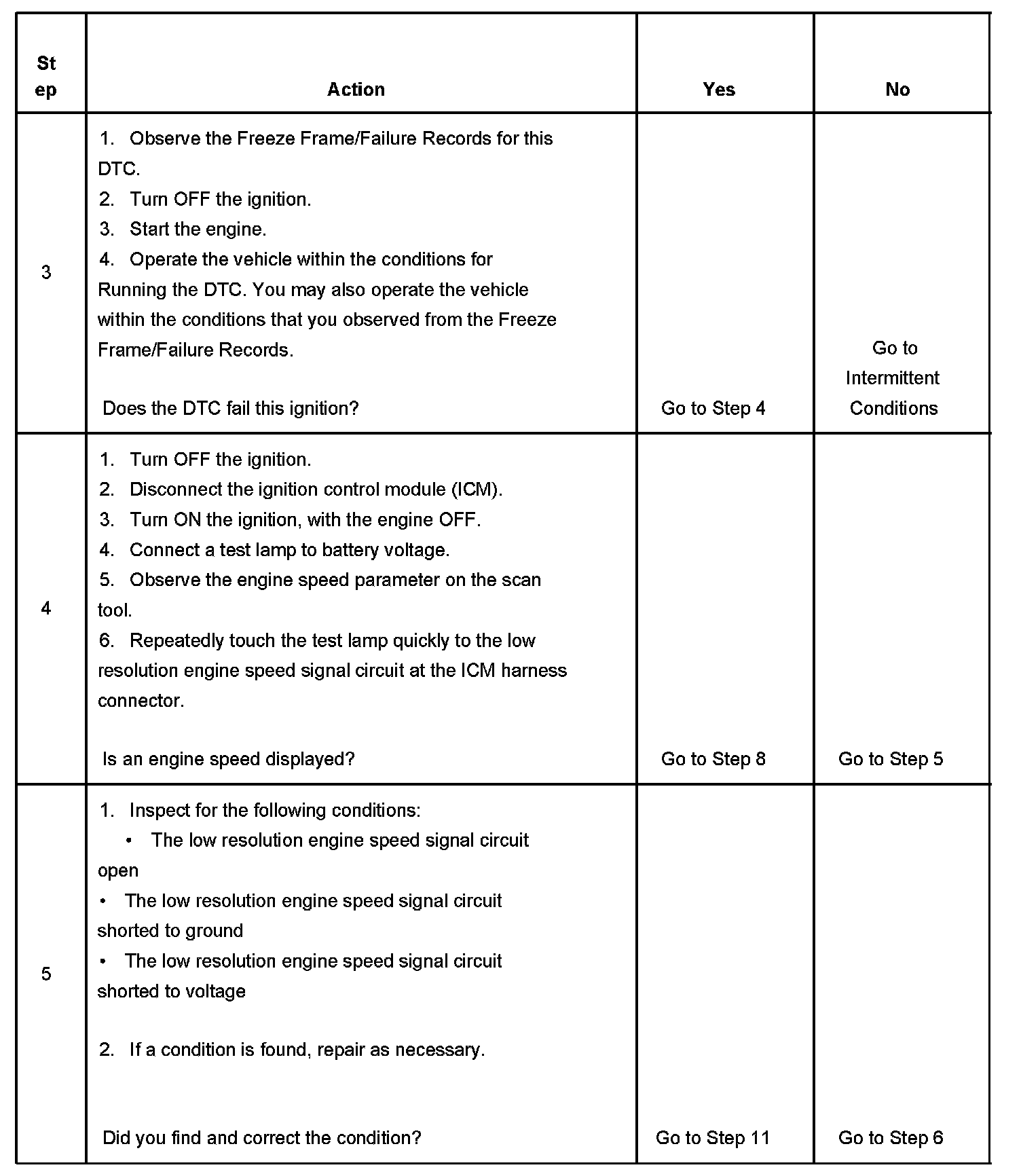 CIRCUIT DESCRIPTIONThe 3X reference signal is produced by the ignition control module (ICM). The ICM calculates the 3X reference signal by dividing the crankshaft position (CKP) sensor 18X pulses by 3 when the engine is running and CKP sync pulses are also being received. The powertrain control module (PCM) uses the 3X reference signal to calculate engine RPM and crankshaft position at engine speeds above 1,200 RPM. The PCM also uses the pulses on this circuit to initiate injector pulses. The PCM constantly monitors the number of pulses on the 3X reference circuit and compares the number of 3X reference pulses to the number of 18X reference pulses and CAM signal pulses being received. The PCM will use the 18X reference signal circuit for fuel and ignition control. The engine will continue to start and run using the 18X reference and camshaft position PCM input signals only. If the PCM detects an incorrect number of pulses on the 3X reference circuit, DTC P1374 sets.