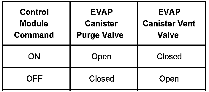 The table illustrates the relationship between the ON and OFF states, and the Open or Closed states of the EVAP canister purge and vent valves.