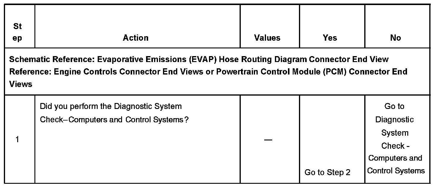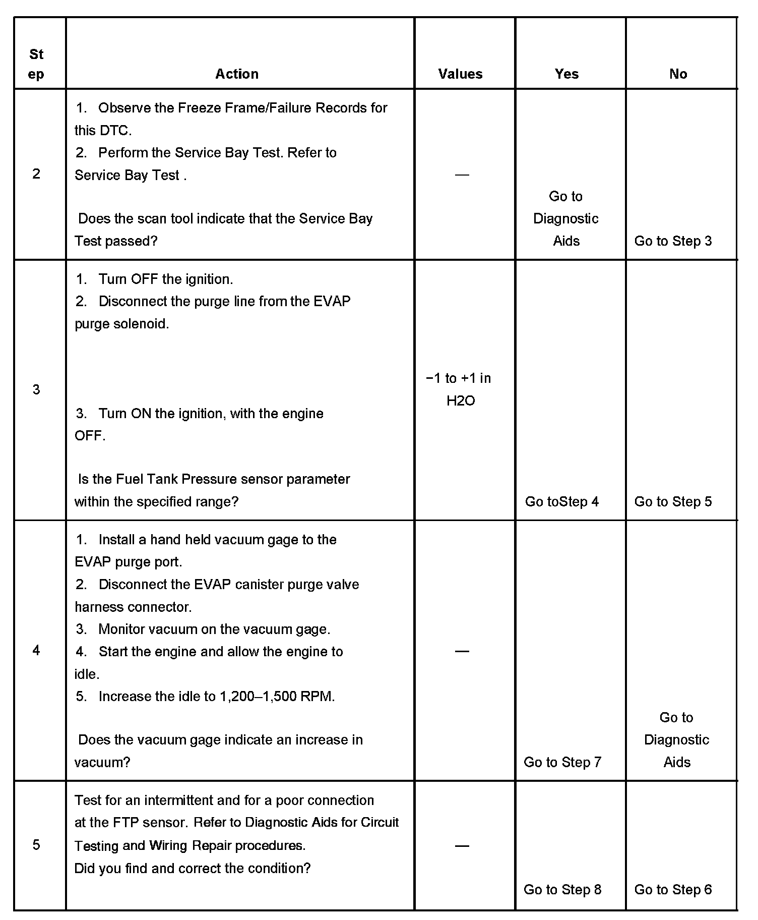 SYSTEM DESCRIPTIONThis DTC tests for undesired intake manifold vacuum flow to the evaporative emission (EVAP) system. The control module seals the EVAP system by commanding the EVAP canister purge valve Closed and the EVAP canister vent valve Closed. The control module monitors the fuel tank pressure (FTP) sensor to determine if a vacuum is being drawn on the EVAP system. If vacuum in the EVAP system is more than a predetermined value within a predetermined time, this DTC sets.