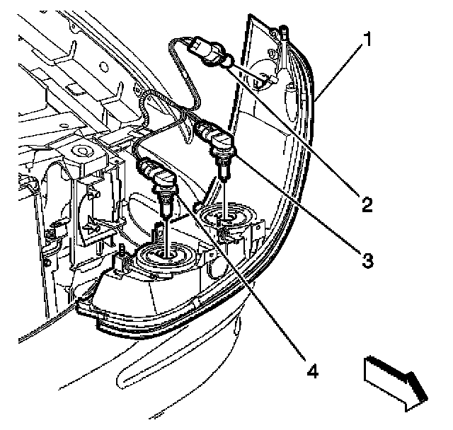 2. Remove the inoperative headlamp bulb (3 or 4) from the headlamp assembly (1).