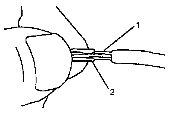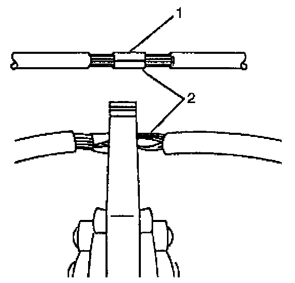 7. Center the splice clip (2) over the stripped wires (1) and hold the clip in place.