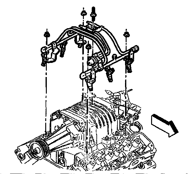 12. Remove the fuel rail with equal force on both sides of the fuel rail.