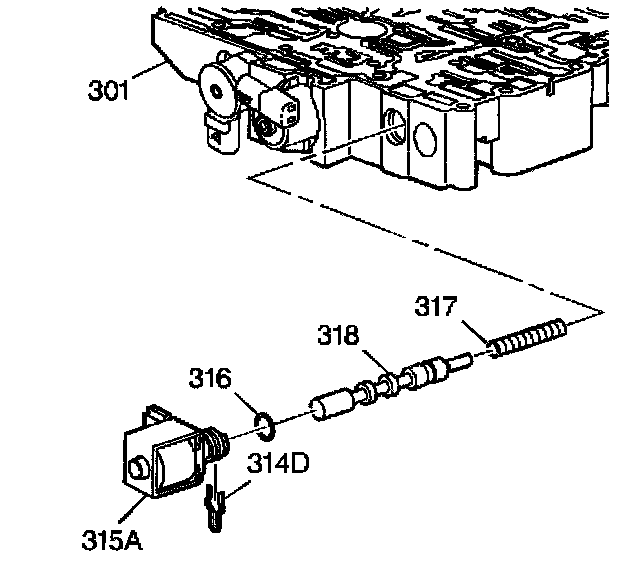4. Hold the 1-2 shift solenoid valve (315A) in the control valve body (301). Install the 1-2 shift solenoid valve retainer (314D) into the control valve body (301).