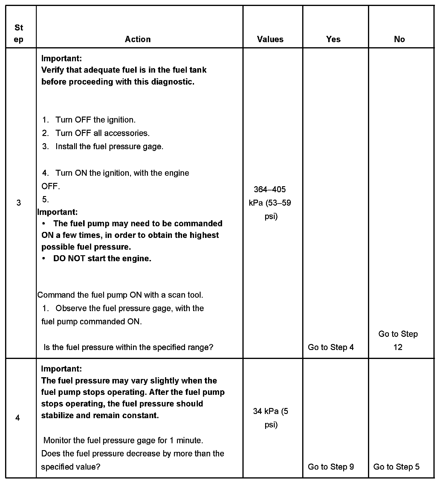 4. This step tests for an internal fuel leak. If the fuel pressure decreases during this test, an internal loss of pressure is indicated.