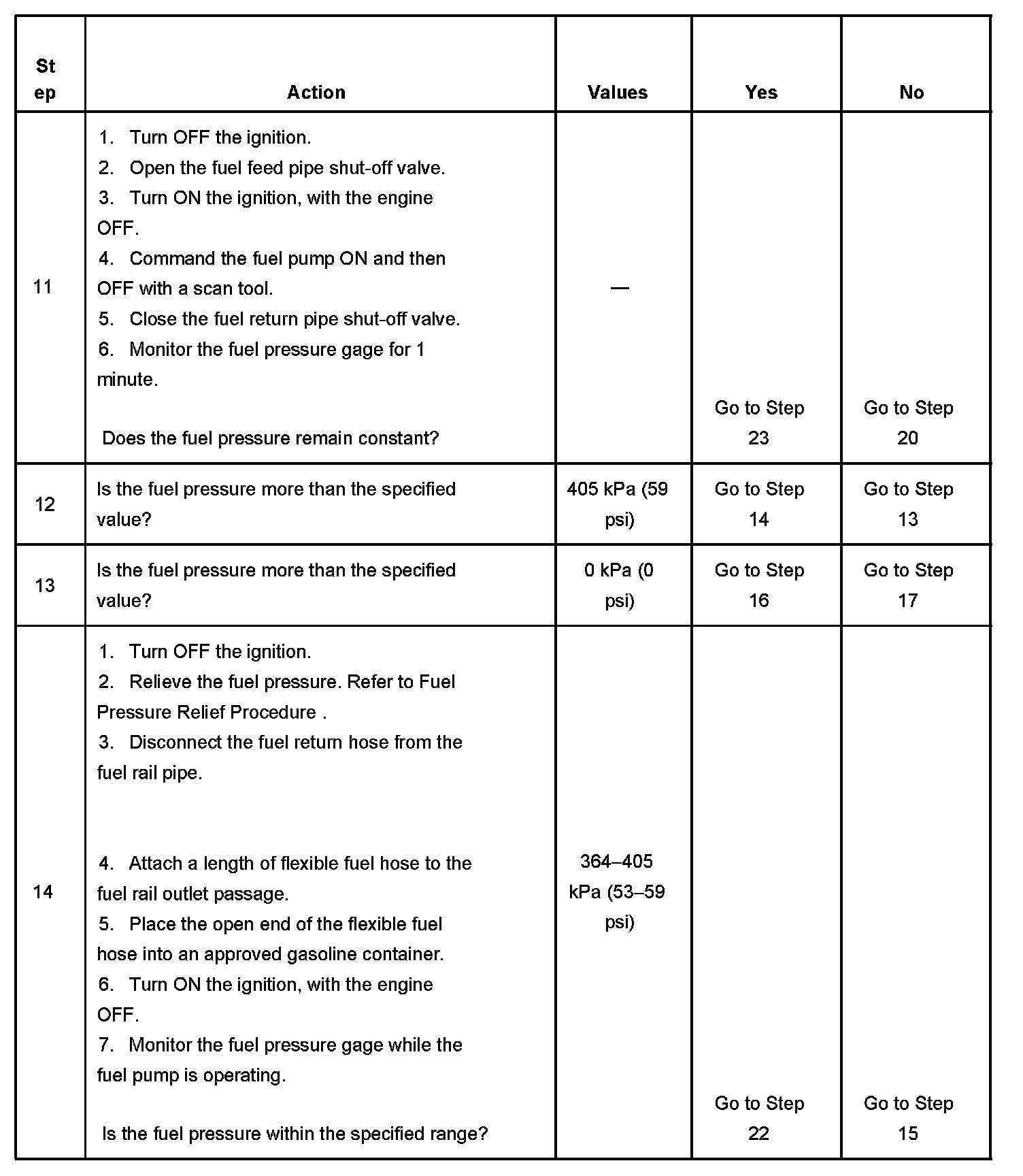 14. This step tests for a restricted fuel return pipe. If the fuel pressure is within the specified values, a restriction in the fuel return pipe is indicated.