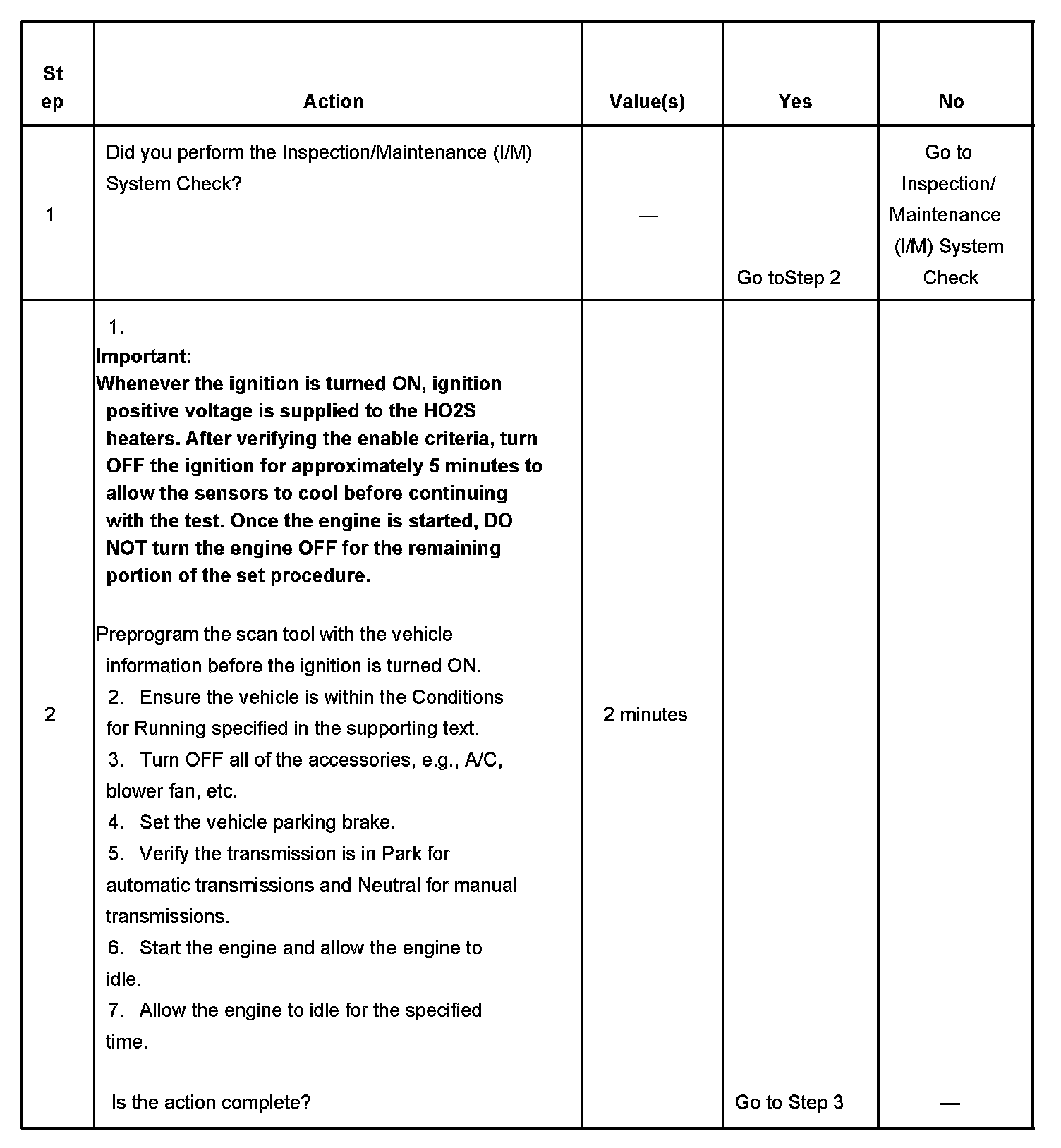 The purpose of the I/M Complete System Set Procedure is to satisfy the enable criteria necessary to execute all of the I/M readiness diagnostics, and complete the trips for those particular diagnostics. When all diagnostic tests are completed, the I/M System Status indicators are set to YES. Perform this test when more than one or all of the I/M System Status indicators are set to NO.