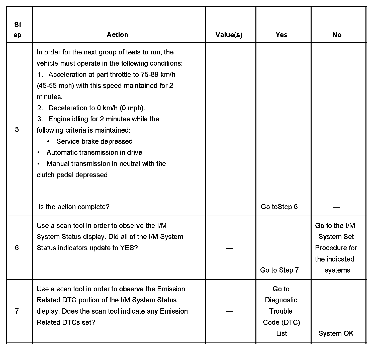 The scan tool can be used to monitor each of the I/M System Status indicators during the I/M Complete System Set Procedure. When all of the indicators for a test step have updated to YES, testing can move on to the next step even if the remaining portion of the test is not complete. For example, step 3 is designed to run the evaporative emission (EVAP), secondary air injection (AIR), and heated oxygen sensor (HO2S) tests. The procedure instructs the technician to operate the vehicle in the enable conditions for 6 minutes. If all 3 tests have updated to YES within 4 minutes, it is not necessary to continue with the enable conditions and testing can advance to the next step.